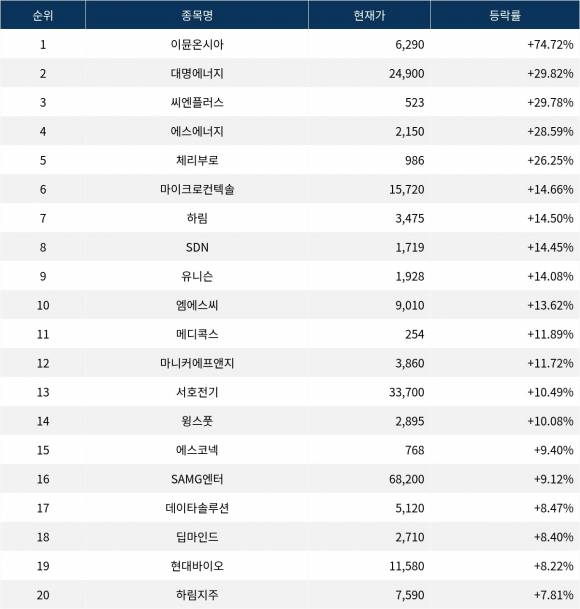 이어 상승률 2위 대명에너지(389260)는 현재가 24,900원으로 주가가 29.82% 상한가를 기록 중이다. 상승률 3위 씨엔플러스(115530)는 현재 523원으로 29.78% 폭등하며 강세를 보이고 있다. 상승률 4위 에스에너지(095910)는 28.59% 폭등하며 2,150원에 거래되고 있다. 상승률 5위 체리부로(066360)는 26.25%의 상승세를 타고 986원에 거래되고 있다.