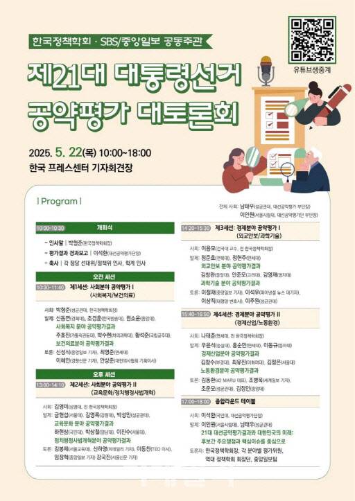 공약 평가와 토론회는 △사회복지·보건의료 △교육문화·정치행정사법개혁 △외교안보·과학기술 △경제산업·노동환경 등 4개 세션으로 나눠 진행한다.