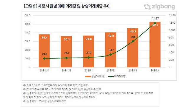 부동산 플랫폼 직방이 국토교통부 매매 실거래가 자료를 분석한 결과 지난달 세종시의 상승 거래 비중은 52.7%로 전월(45.3%) 대비 7.4%포인트 올랐다고 오늘(19일) 밝혔습니다.