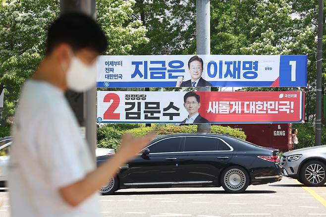| ▲ 제21대 대통령 선거를 22일 앞두고 공식 선거운동이 시작된 12일 서울 서초구 서울고속버스터미널 역 인근에 더불어민주당 이재명 후보와 국민의힘 김문수 후보의 현수막이 걸려 있다. |