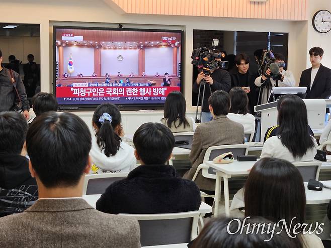 | ▲ 광주광역시 광산구 성덕고등학교 학생들이 지난 4일 오전 교실에서 헌법재판소의 윤석열 대통령 탄핵심판 선고 과정을 텔레비전 생중계로 지켜보고 있다. 본문과 직접적 관련 없는 자료사진. |