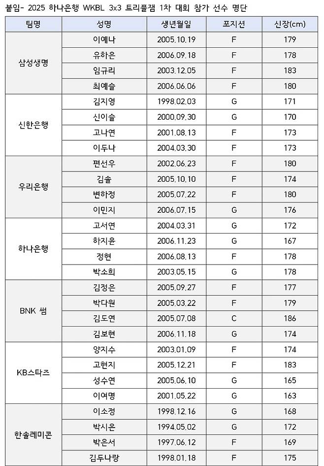 WKBL(한국여자농구연맹)은 오는 24일 부천체육관에서 열리는 ‘2025 하나은행 WKBL 3x3 트리플잼(Triple Jam)’ 1차 대회 참가팀 및 출전 선수 명단을 확정했다. 1차 대회는 삼성생명, 신한은행, 우리은행, 하나은행, BNK 썸, KB스타즈 WKBL 6개 구단과 특별 초청팀 자격으로 합류한 한솔레미콘 등 총 7개 팀이 참가한다.