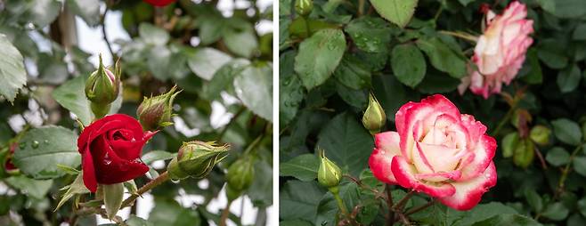 | ▲ 17일, 섬진강기차마을장미 오전에 비가 와서 이슬이 맺힌 장미들 |
