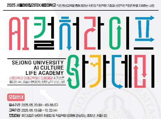 세종대학교 미래교육원은 서울시 및 서울시평생교육진흥원이 주관하는 '2025 서울마이칼리지' 사업의 운영기관으로 선정돼 중장년층을 위한 융합형 직업교육 프로그램인 'AI컬처 라이프 아카데미'를 새롭게 운영한다고 19일 밝혔다.