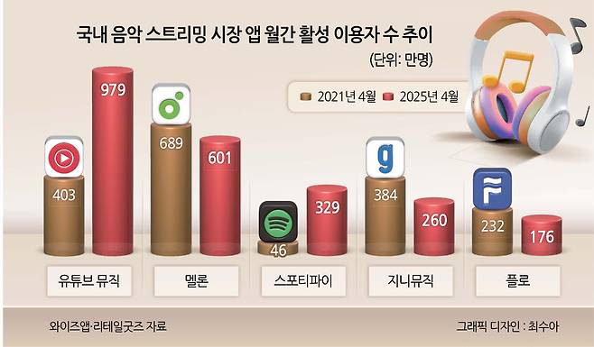 해외 플랫폼의 시장 공세는 가속이 붙고 있다. 2021년 4월만 해도 유튜브 뮤직·스포티파이의 이용자 총수는 449만명 수준에 그쳤다. 불과 4년 만에 3배 가까이 이용자를 확대하면서, 국내 시장 절반 이상을 장악한 셈이다.