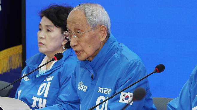 ▲ 더불어민주당 윤여준 총괄선대위원장이 19일 서울 여의도 당사에서 열린 중앙선거대책위원회의에서 발언하고 있다.