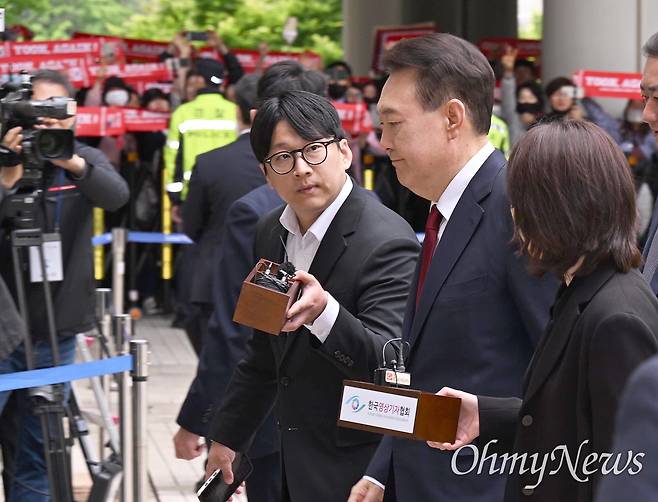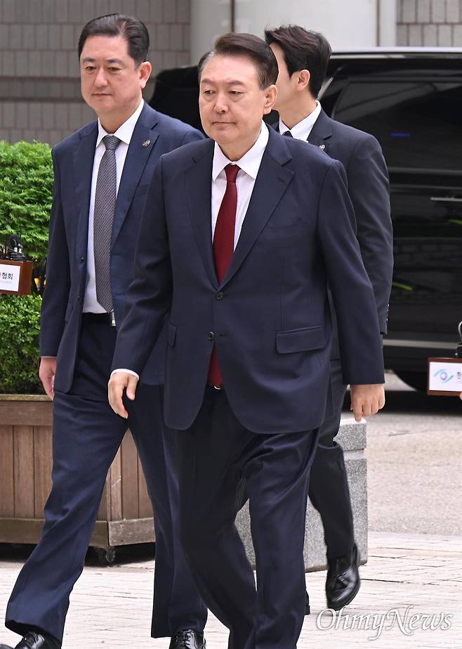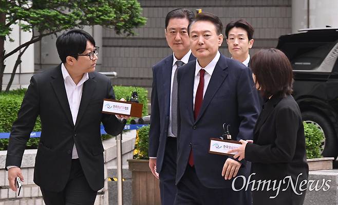 이번에도 말이 없었다. 19일 오전 10시경 서울중앙지방법원 서관 앞에 내린 전 대통령 윤석열씨는 취재진의 포토라인을 그대로 지나쳐 법원 청사 안으로 들어갔다. 가지런한 2 대 8 가르마, 짙은 남색 계열의 정장에 붉은색 넥타이까지, 일주일 전(12일) 첫 번째 지상 출입 상황과 똑같았다.