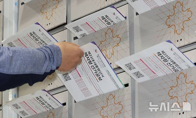 [서울=뉴시스] 조수정 기자 = 우정사업본부 집배원이 21대 대통령선거일을 15일 앞둔 19일 서울 강남구 한 오피스텔에서 책자형 선거공보물을 우편함에 투함하고 있다. 2025.05.19. chocrystal@newsis.com