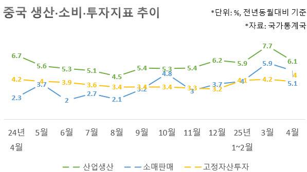 중국이 미국과 관세 전쟁 여파 속 생산·소비 지표가 주춤한 모습을 보였다.