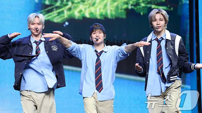 (서울=뉴스1) 권현진 기자 = 라이즈(RIIZE) 은석(왼쪽부터)과 소희, 쇼타로가 19일 오전 서울 용산구 블루스퀘어에서 가진 첫 정규 앨범 '오디세이(ODYSSEY)' 발매 기념 쇼케이스에서 타이틀 곡 'Fly Up'(플라이 업)을 선보이고 있다, 2025.5.19/뉴스1