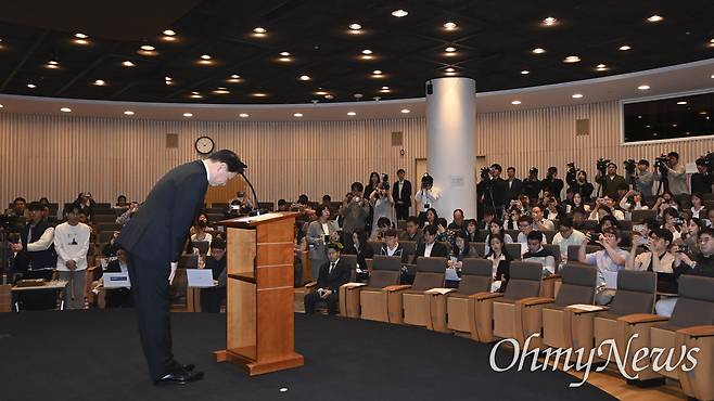 | ▲ 최태원 SK 회장이 지난 7일 오전 서울 중구 SKT타워에서 열린 SKT 해킹 관련 일일브리핑에 참석해 대국민 사과를 하고 있다. |