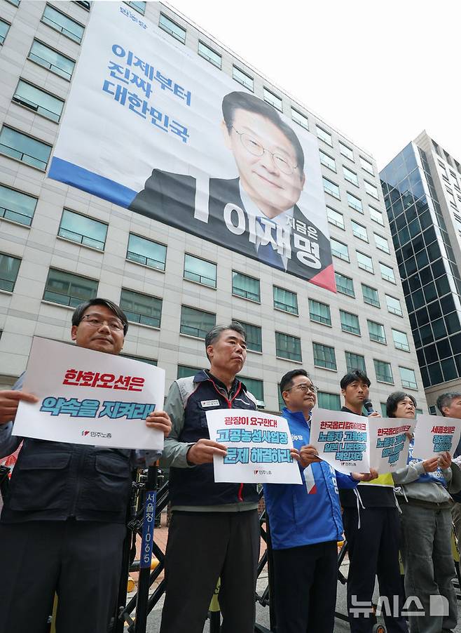 [서울=뉴시스] 김진아 기자 = 전국민주노동조합총연맹(민주노총) 조합원들이 19일 오전 서울 여의도 이재명 더불어민주당 대선후보 캠프 앞에서 '고공농성사업장 문제해결 촉구 10만인 서명운동 돌입 기자회견'을 하고 있다. 2025.05.19. bluesoda@newsis.com
