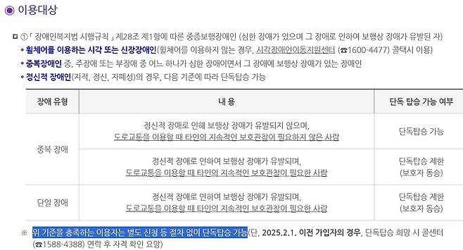 | ▲ '기준을 충족하는 이용자는 별도의 신청 등 절차 없이 단독 탑승 가능'하다고 설명하고 있다(서울시설공단 누리집에서 갈무리). |