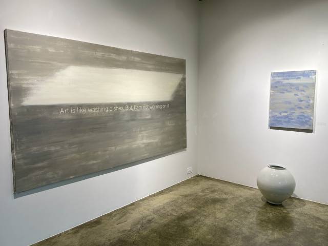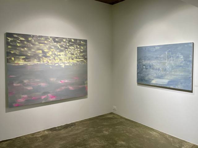 이번에 선보이는 작품들은 대부분 텍스트를 품고 있다. 인쇄되거나 시트지를 붙인 듯 보이지만 실은 수십번의 붓질로 만들어낸 것들이다. 이는 보이지 않는 회화성을 나타내는 동시에 작가와 감상자, 회화와 텍스트가 관계하는 도구로 작용한다.