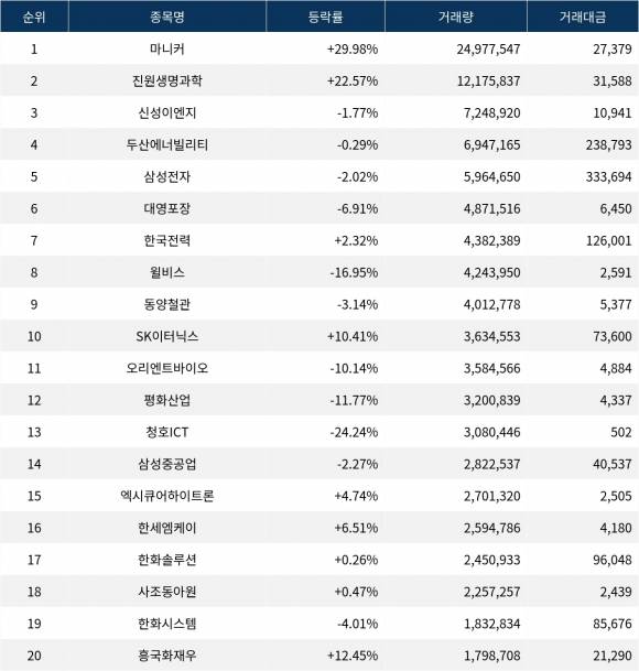 한편 거래량 상위 20위권 종목들은 오리엔트바이오(002630) ▼-10.14%, 평화산업(090080) ▼-11.77%, 청호ICT(012600) ▼-24.24%, 삼성중공업(010140) ▼-2.27%, 엑시큐어하이트론(019490) ▲4.74%, 한세엠케이(069640) ▲6.51%, 한화솔루션(009830) ▲0.26%, 사조동아원(008040) ▲0.47%, 한화시스템(272210) ▼-4.01%, 흥국화재우(000545) ▲12.45% 등의 성적을 기록했다.