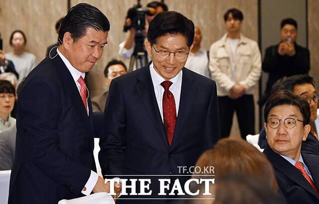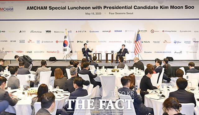 [더팩트ㅣ임영무 기자] 김문수 국민의힘 대선 후보(왼쪽)가 19일 서울 종로구 포시즌스호텔에서 열린 주한미국상공회의소(AMCHAM·암참) 초청 특별 오찬 간담회에 참석해 제임스 김 암참 회장과 대담하고 있다.