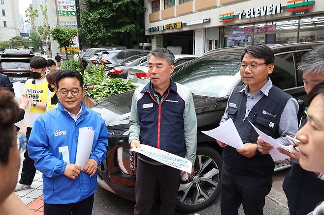 | ▲ 이날 기자회견에 함께 참여한 민병덕 더불어민주당 을지키는민생실천위원장(사진 상 좌측)이 기자회견 직전 홍지욱 민주노총 부위원장(사진 상 중앙)과 고공농성 사업장 조합원들의 의견을 직접 경청했다. |