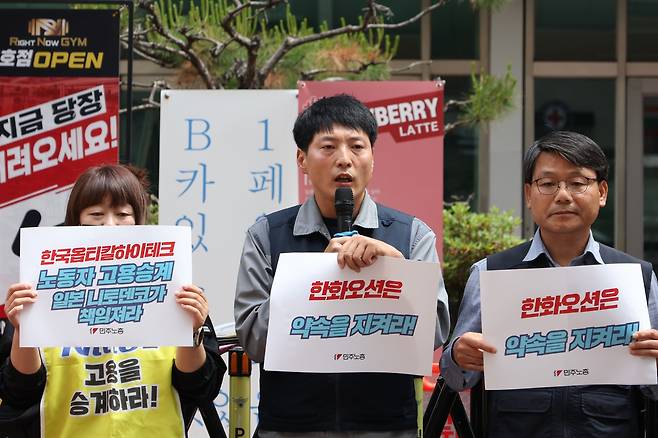 민주노총은 19일 오전 11시 서울 여의도 용산빌딩에 위치한 이재명 더불어민주당 대선후보 캠프 앞에서 '고공농성 사업장 문제 해결 촉구 10만인 서명운동 돌입 기자회견'을 열고 시민·노동자들의 목소리를 각 대선후보에게 전하겠다고 밝혔다.