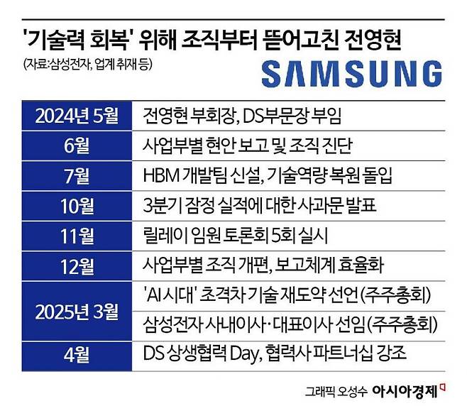 전 부회장은 부임 직후 사업부별 현안을 보고받고 조직 진단에 나섰다. 두 달이 채 지나지 않은 2024년 7월 고대역폭메모리(HBM) 전담 개발팀을 신설하면서 기술 역량 복원에 돌입했다. 그해 10월 3분기 잠정 실적이 나오자 "모든 책임은 사업을 이끄는 경영진에 있다"며 '사과문'을 발표하기도 했다. 삼성 수뇌부가 실적과 관련해 별도 메시지를 낸 건 처음이었다.