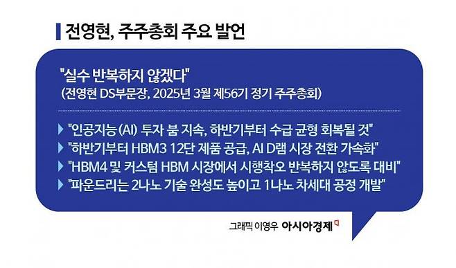 전영현 부회장도 올해 3월 주주총회에서 이런 구상을 밝혔다. 그는 "하반기부터 HBM3 12단 제품을 빠르게 시장에 공급할 계획"이라며 "HBM4 및 커스텀 HBM 시장에서 시행착오를 반복하지 않도록 철저히 대비하고 있다"고 했다. 또 "파운드리는 2나노 기술 완성도를 높이고, 1나노대 차세대 공정을 개발해 글로벌 시장에서 강한 기술·제조 역량을 갖추겠다"고 설명했다.