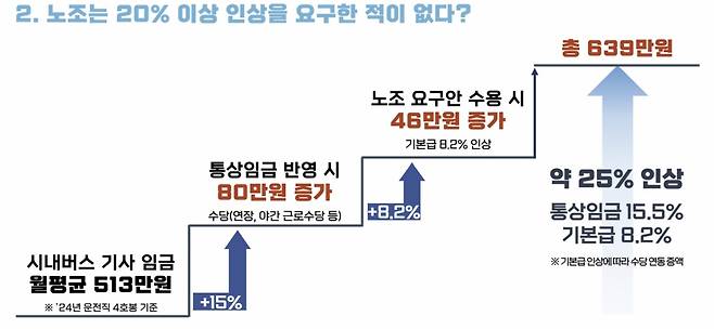 노조가 20% 이상 임금인상을 요구한 적이 없다고 주장한 데 대해선 "통상임금(80만원) 반영과 기본급 8.2% 인상(46만원)을 수용하면 버스 기사 임금이 월평균 513만원(운전직 4호봉 기준)에서 639만원으로 약 25% 오른다"며 "명시적으로 요구하지 않았을 뿐 실질적인 임금인상 효과가 발생한다"고 반박했다.