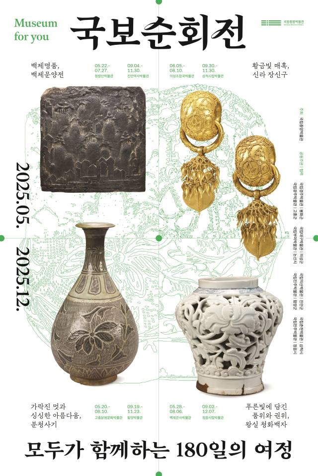 전국을 찾아가는 보물의 여행은 ‘백제 명품 문양전(5.22~7.27 봉화청량산박물관, 9.4~11.30 진안역사박물관)’, ‘신라 장신구의 황금빛 매혹(6.5~8.10 의성조문국박물관, 9.30~11.30 삼척시립박물관)’, ‘가락진 멋과 싱싱한 아름다움, 분청사기(5.20~8.10 고흥분청문화박물관, 9.19~11.23 함양박물관)’, ‘푸른 빛에 담긴 품위와 권위, 왕실 청화백자(5.28~8.6 논산백제군사박물관, 9.2~12.7 정읍시립박물관)’의 네 가지 주제로 기획된다.