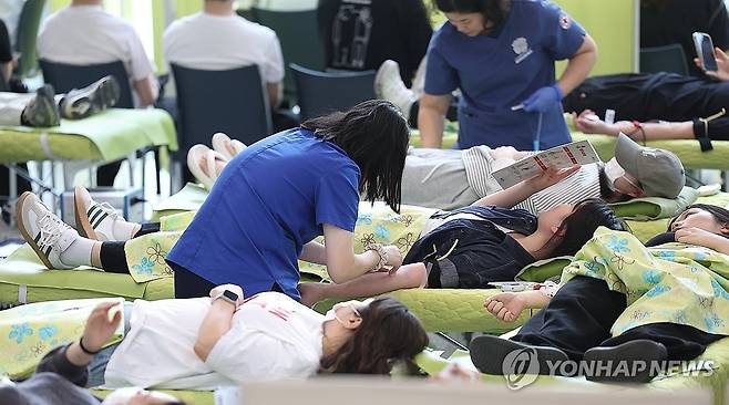(대구=연합뉴스) 윤관식 기자 = 19일 대구 북구 대구보건대학교 본관에서 열린 '제27회 헌혈 사랑 나눔 축제'에 참여한 대학생들이 헌혈하고 있다. 2025.5.19