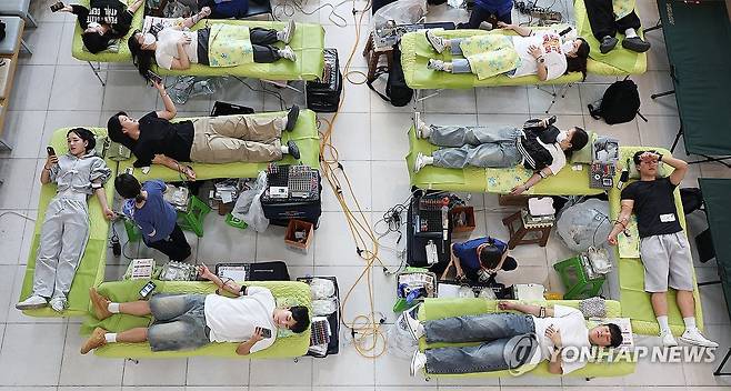 (대구=연합뉴스) 윤관식 기자 = 19일 대구 북구 대구보건대학교 본관에서 열린 '제27회 헌혈 사랑 나눔 축제'에 참여한 대학생들이 헌혈하고 있다. 2025.5.19