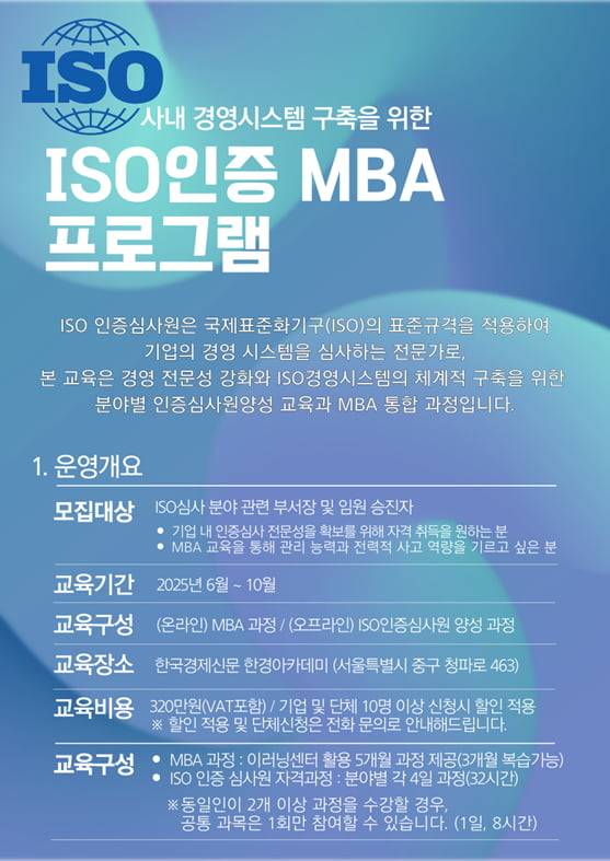 한경아카데미 관계자는 “ISO MBA는 인증심사라는 전문직무에 경영적 사고를 더한 융합형 교육 모델”이라며 “단순 자격 취득을 넘어 인증기관, 컨설팅사, 기업 내 내부심사원 등 다양한 커리어로 확장할 수 있는 최적의 과정”이라고 말했다.