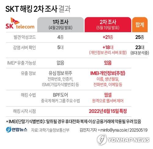(서울=연합뉴스) 김민지 기자 = 19일 SK텔레콤[017670] 해킹 사건을 조사중인 민관 합동 조사단이 발표한 2차 조사 결과에 따르면 SKT 해킹으로 가입자 전원의 유심(USIM) 정보뿐 아니라 개인정보가 관리되는 서버도 악성코드에 감염된 것으로 파악됐다.