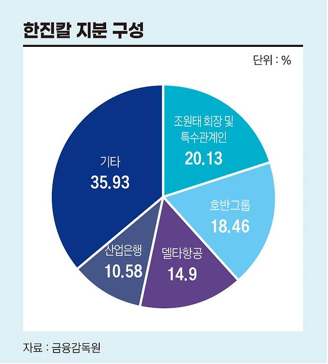 한진그룹의 정점에는 지주사인 한진칼이 있고 한진칼의 최대주주는 조원태 회장과 특수관계인이죠. 사실 조원태 회장 개인 지분은 5.78%에 불과해요. 조 회장의 동생인 조현민 사장 지분도 5.78%이고요. 두 사람 지분 다 합쳐도 11.5% 수준입니다. 여기에 조 회장의 어머니인 이명희 씨 지분 2%와 계열사 지분 등을 전부 더해야 20.13%입니다.