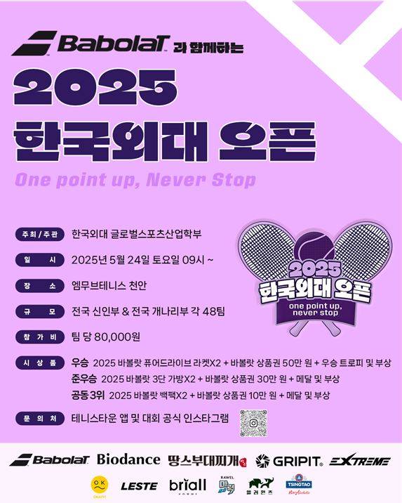 대회 관련 정보와 소식은 인스타그램 공식 계정(@hufsopen_2025)을 통해 확인할 수 있으며, 참가 신청은 ‘테니스타운’ 애플리케이션을 통해 가능하다.