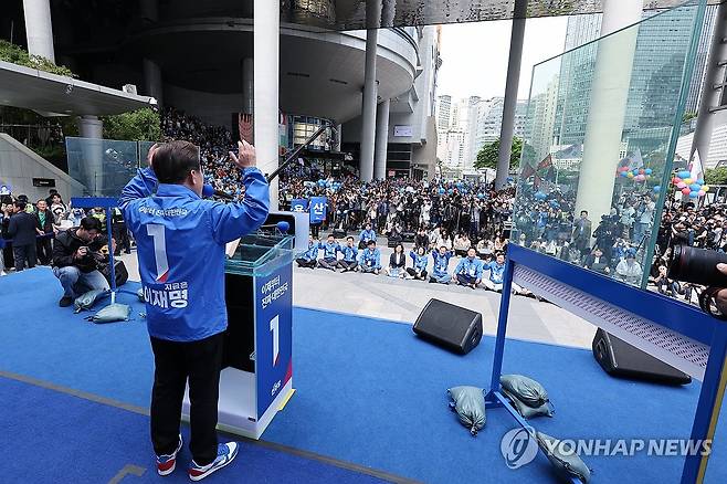 (서울=연합뉴스) 김주성 기자 = 더불어민주당 이재명 대선 후보가 19일 서울 용산역광장에서 열린 집중유세에서 시민들에게 지지를 호소하고 있다. 2025.5.19 [공동취재]