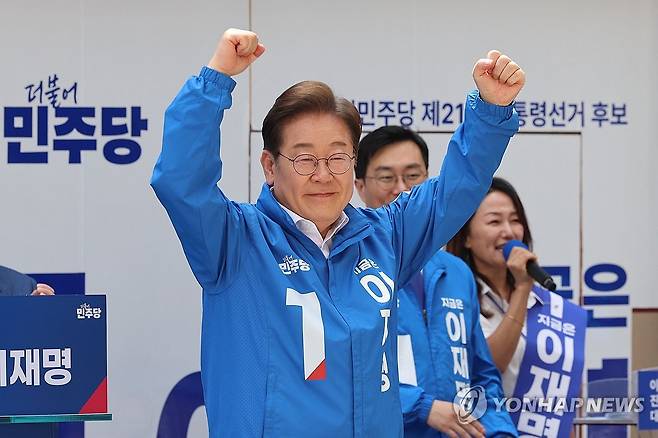 (서울=연합뉴스) 김주성 기자 = 더불어민주당 이재명 대선 후보가 서울 표심 잡기에 나선 19일 서울 용산역광장에서 열린 집중유세에서 시민들을 향해 인사하고 있다. 2025.5.19 [공동취재]