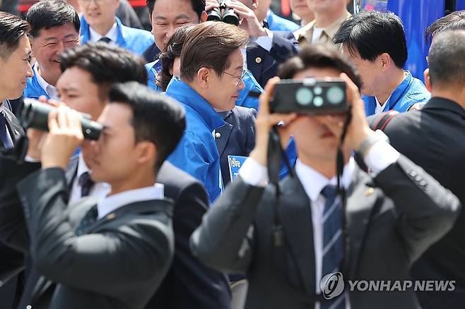 (서울=연합뉴스) 김주성 기자 = 더불어민주당 이재명 대선 후보가 서울 표심 잡기에 나선 19일 서울 용산역광장에서 열린 집중유세에서 의원들과 인사하고 있다. 2025.5.19 [공동취재]