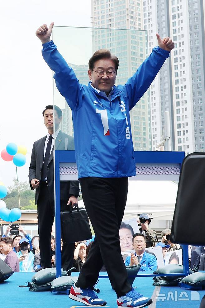 [서울=뉴시스] 권창회 기자 = 이재명 더불어민주당 대선 후보가 19일 서울 용산구 용산역 광장에서 열린 집중유세에서 방탄유리가 설치된 유세차 위에서 지지자들에게 인사하고 있다.(공동취재) 2025.05.19. photo@newsis.com