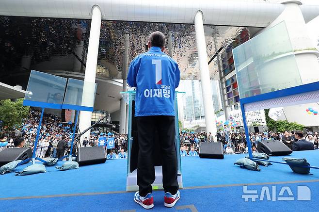 [서울=뉴시스] 권창회 기자 = 이재명 더불어민주당 대선 후보가 19일 서울 용산구 용산역 광장에서 열린 집중유세에서 방탄유리가 설치된 유세차 위에서 지지호소를 하고 있다. 이 후보는 이날 대선 후보 최초로 방탄 유리막 안에서 유세를 시작했다. (공동취재) 2025.05.19. photo@newsis.com