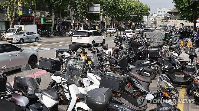 (서울=연합뉴스) 이진욱 기자 = 깊어지는 불황에 올해 들어 넉 달 연속 자영업자가 감소세를 보였다. 문을 닫는 자영업자가 늘면서 정부에 폐업 지원을 신청한 건수는 이미 연간 목표치인 3만건에 육박했다. 통계청에 따르면 지난달 자영업자는 561만5천명으로 작년 같은 달보다 6천명 줄었다. 사진은 19일 서울 한 재래시장 부근에 배달 오토바이가 대기해 있는 모습. 2025.5.19