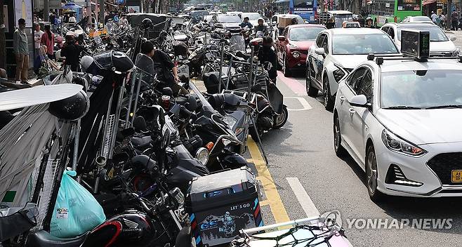 (서울=연합뉴스) 이진욱 기자 = 깊어지는 불황에 올해 들어 넉 달 연속 자영업자가 감소세를 보였다. 문을 닫는 자영업자가 늘면서 정부에 폐업 지원을 신청한 건수는 이미 연간 목표치인 3만건에 육박했다. 통계청에 따르면 지난달 자영업자는 561만5천명으로 작년 같은 달보다 6천명 줄었다. 사진은 19일 서울 한 재래시장 부근에 배달 오토바이가 대기해 있는 모습. 2025.5.19