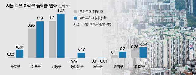 구로구는 토허구역 확대 전후 상승률이 0.02%에서 0.26%로 올라 서울에서 가장 큰 상승 폭을 기록했다. 동대문구는(-0.04→0.17%) 0.21%포인트 올라 마포구(0.23%포인트)와 성동구(0.22%포인트)에 이어 4위를 기록했다. 노원구는 -0.11%에서 -0.01%로 하락 폭을 크게 줄였다.