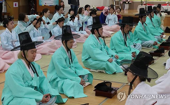 (부산=연합뉴스) 강선배 기자 = 제53회 성년의 날인 19일 부산 사상구 부산여성문화회관에서 열린 기념식에서 올해 성년이 된 2006년생 청소년들에게 족두리와 갓을 씌워주고 있다. 성년의 날은 매년 5월 셋째 주 월요일로 법정기념일이다. 2025.5.19