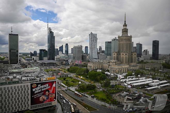 (바르샤바 AFP=뉴스1) 권영미 기자 = 18일(현지시간) 찍은 폴란드의 랜드마크인 문화과학궁전(오른쪽 건물). 이날 폴란드에서는 대선 1차 투표가 실시됐다. 2025.05.18.
