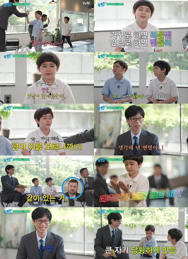 또한 윌리엄은 형제간 자주 싸우는 이유를 묻자 "(벤틀리가) '야' 아니면 '윌리엄'이라고 불러서"라고 답했다. 그러자 벤틀리는 "형아 이름을 모르니까"라고 해명했다. 유재석은 "생각해 낸 변명이..."이라며 벤틀리의 엉뚱한 면모에 웃음을 참지 못했다.