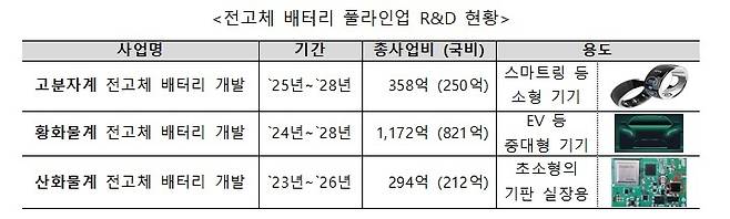 이번 사업은 급성장하는 소형 IT와 웨어러블기기 시장을 겨냥한 전고체 배터리 개발을 목표로 하며 올해부터 오는 2028년까지 국비 250억 원, 민간 108억 원 등 모두 358억 원을 투입할 예정이다.