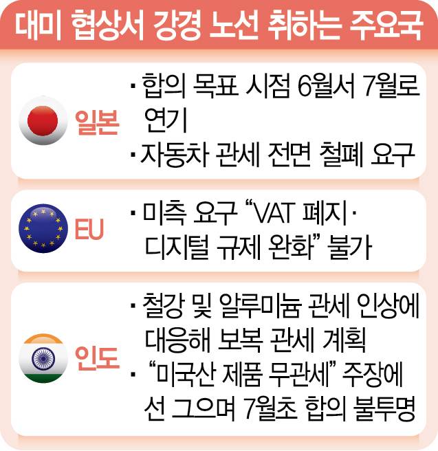 미중 관세 협상 과정에서 ‘중국의 버티기’가 성과를 냈다고 판단한 주요국들이 유화책보다는 강경책으로 선회하는 양상이다. 미국과 관세 협상을 벌이고 있는 일본, 유럽연합(EU), 인도 등이 대미 협상 전략을 다시 짜면서 협상 타결 시기가 당초 예상보다 늦어질 수 있다는 관측이 나온다.