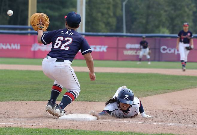| ▲ 2024 세계 여자야구 월드컵 예선 A그룹 조별리그에서 한국-홍콩전 당시, 대표팀 내야수 박소연이 슬라이딩을 하는 모습. |