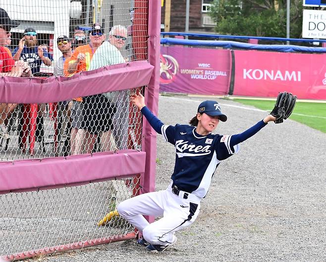 | ▲ 한국 여자야구 국가대표 내야수 김현희가 2024 세계 여자야구 월드컵 예선전 멕시코전에서 3루 파울 펜스를 붙잡고 넘어지면서까지 공을 잡아내는 모습. 그는 이 공을 잡다가 펜스에 이마를 세게 부딪히기도 했다. |