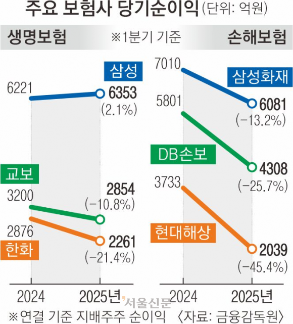 지난해까지 역대 최대 실적을 갈아치우던 보험사들이 올해는 고전을 면치 못하고 있다. 올 1분기 생명·손해보험업계에서 각각 3위 내에 드는 ‘빅3’ 보험사 중에는 삼성생명이 유일하게 순이익이 늘었고, 이외 보험사들은 뒷걸음질 쳤다. 손보 업계에선 일부 상위사의 순이익이 반토막 수준으로 줄어들기도 했다.