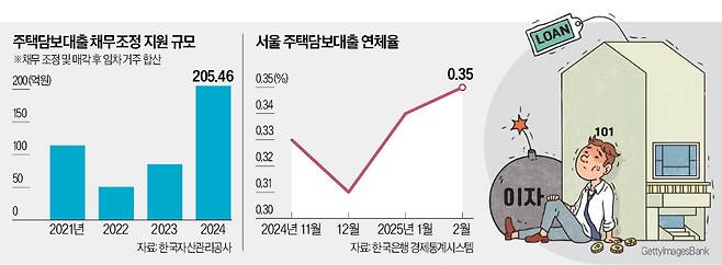 대출을 최대한 끌어모아 주택을 구매한 차주의 주담대 연체가 이어져 올해 채무조정 지원 규모가 더 늘어날 것이란 전망이 나온다. 지난 2월 말 기준 국내 은행의 서울 지역 주담대 연체율(1개월 이상 연체)은 0.35%를 기록했다. 관련 통계가 작성된 2019년 12월 이후 가장 높은 수치다. 지난해 12월 0.31%에서 올 1월 0.34%로 뛰며 역대 최고치를 경신한 데 이어 두 달 연속 기록을 갈아치웠다.