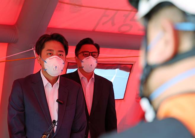 | ▲ 개혁신당 이준석 대선후보가 19일 오후 광주 광산구 금호타이어 광주공장 화재 현장에서 소방 관계자의 브리핑을 듣고 있다. 2025.5.19 |